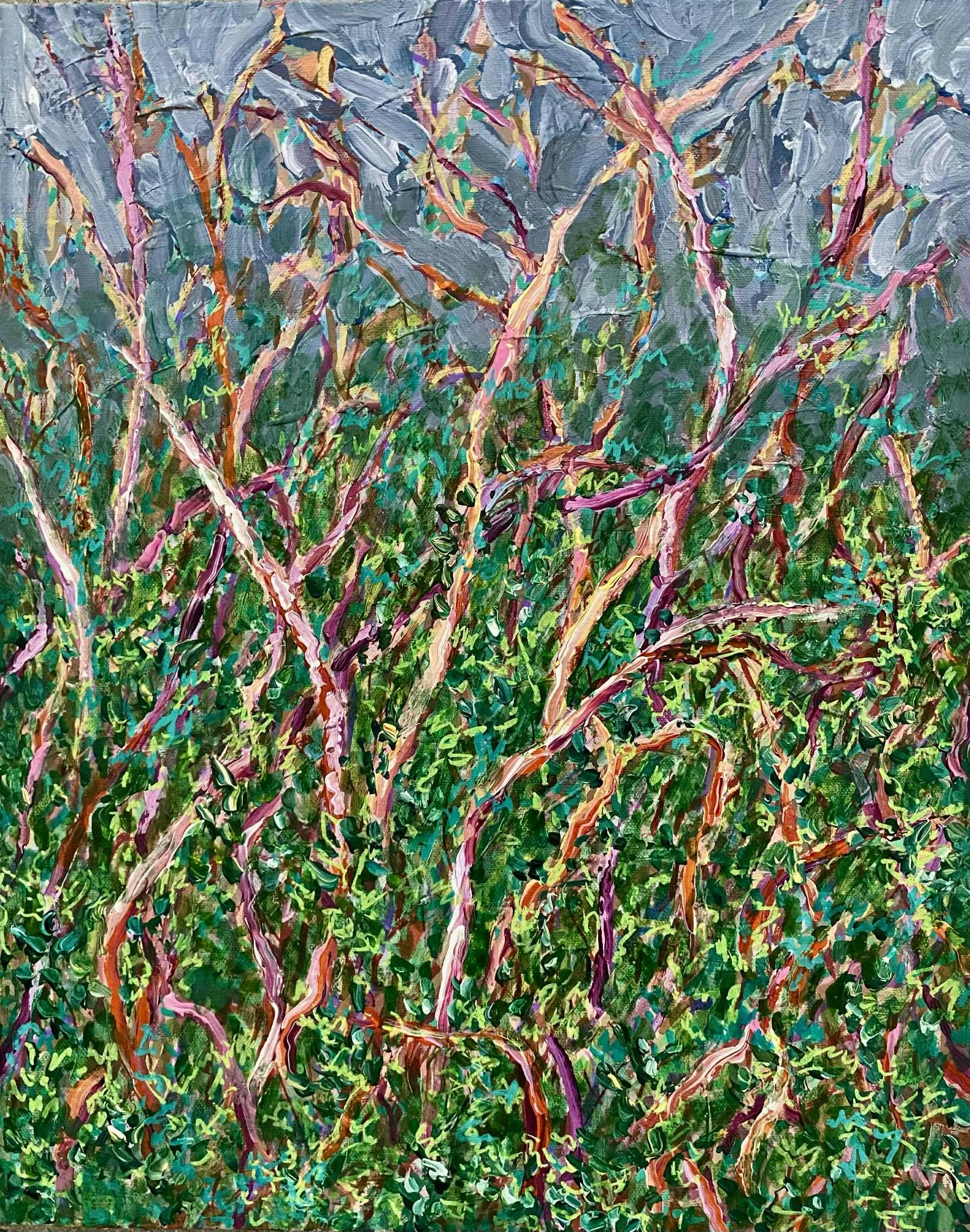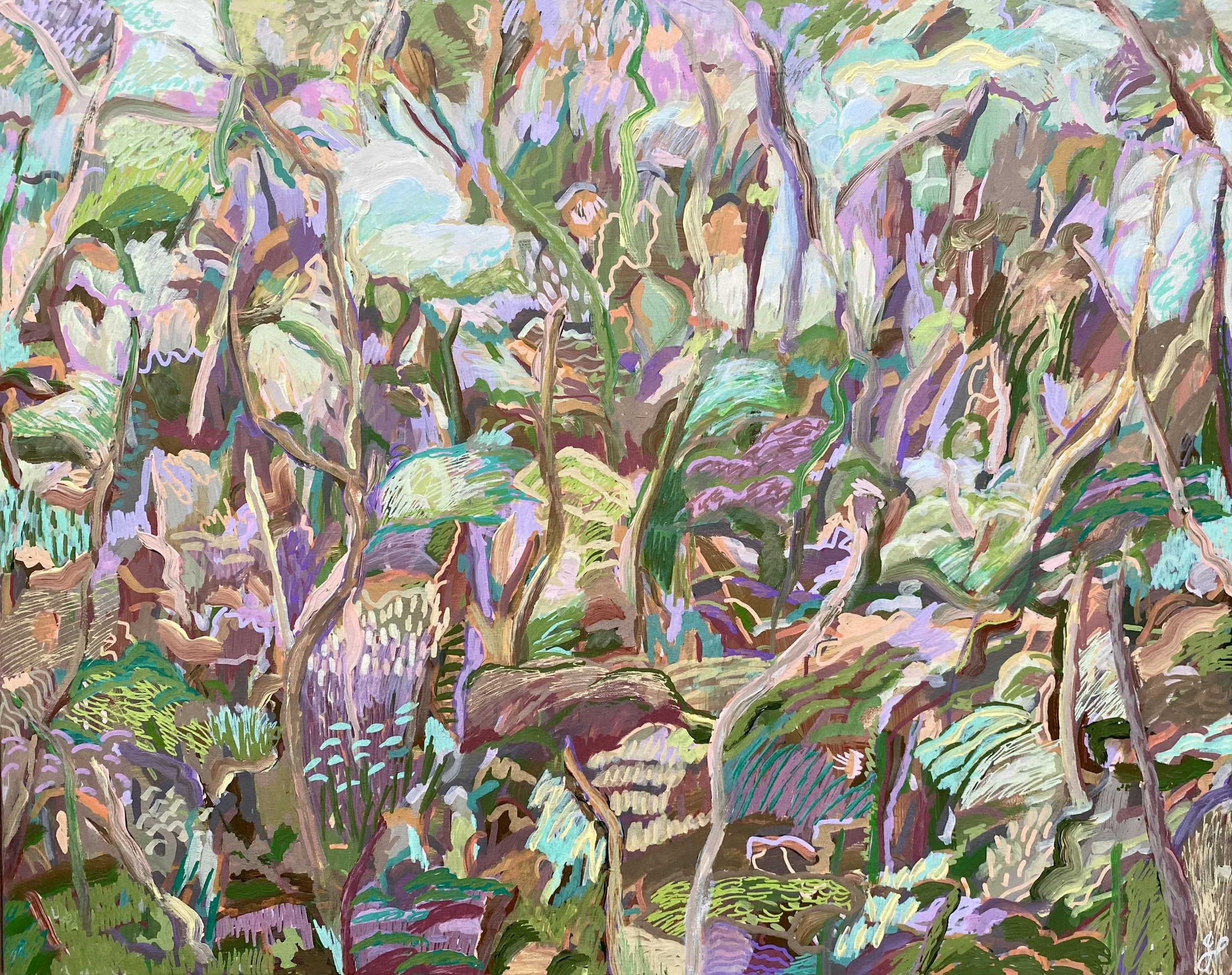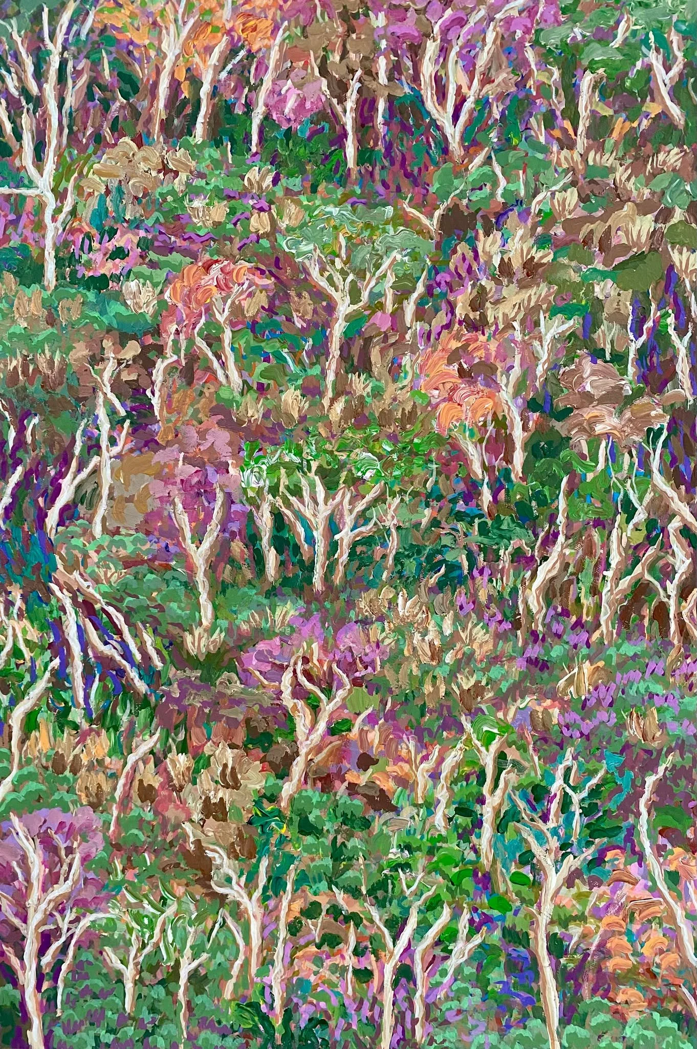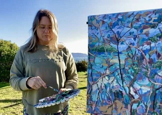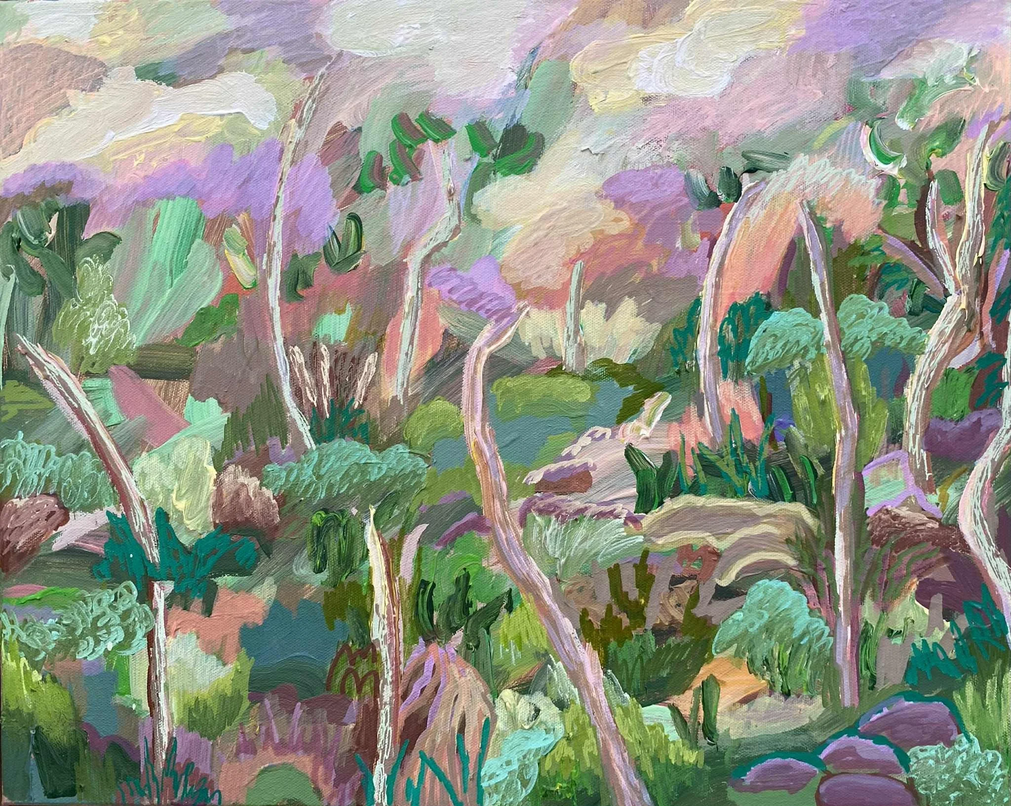 I am at my calmest when I’m immersed in secluded nature and all else that distracts me has the chance to fade away. It’s a stunning place of reflection; of solace and rest. I want to explore the art of dwelling in the moment. My desire is to paint the feeling that I experience when I’m in those places that silence my crazy inner world. If a viewer observes my work and feels drawn into a sense of calm, then I feel I have reached my goal. I used to be obsessed with water, but my latest fascination with trees and bushland has overtaken that love. There is something so rugged, wild and beautiful about our Tassie forest that it cannot be compared easily to the rest of our country. I want to relish this scenery and enjoy what it has to offer me.